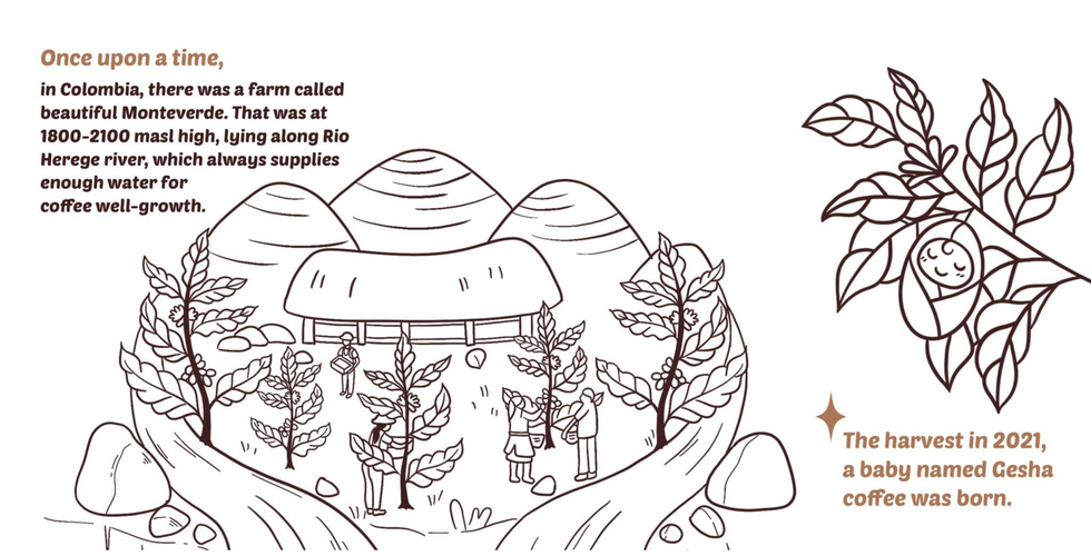 Mình đã làm việc với team @tiduworkshop để thiết kế ra nhân vật cà phê Gesha này (cà phê Gesha vốn nhạy cảm nên mình nghĩ tạo hình nhân vật nữ sẽ phù hợp hơn) Thông qua chuỗi ngày rong chơi tắm nắng, tắm mưa và nhận sự chăm sóc từ người nông dân… cà phê Gesha dần nhận thấy trách nhiệm của mình và đã ra sức luyện tập ở nhiệt độ cao (đây là hình ảnh tượng trưng cho hoạt động rang) Phần còn lại của câu chuyện mình nghĩ các coffee lover đều hiểu, mỗi hành động tượng trưng cho một hoạt động trong chuỗi cung ứng.